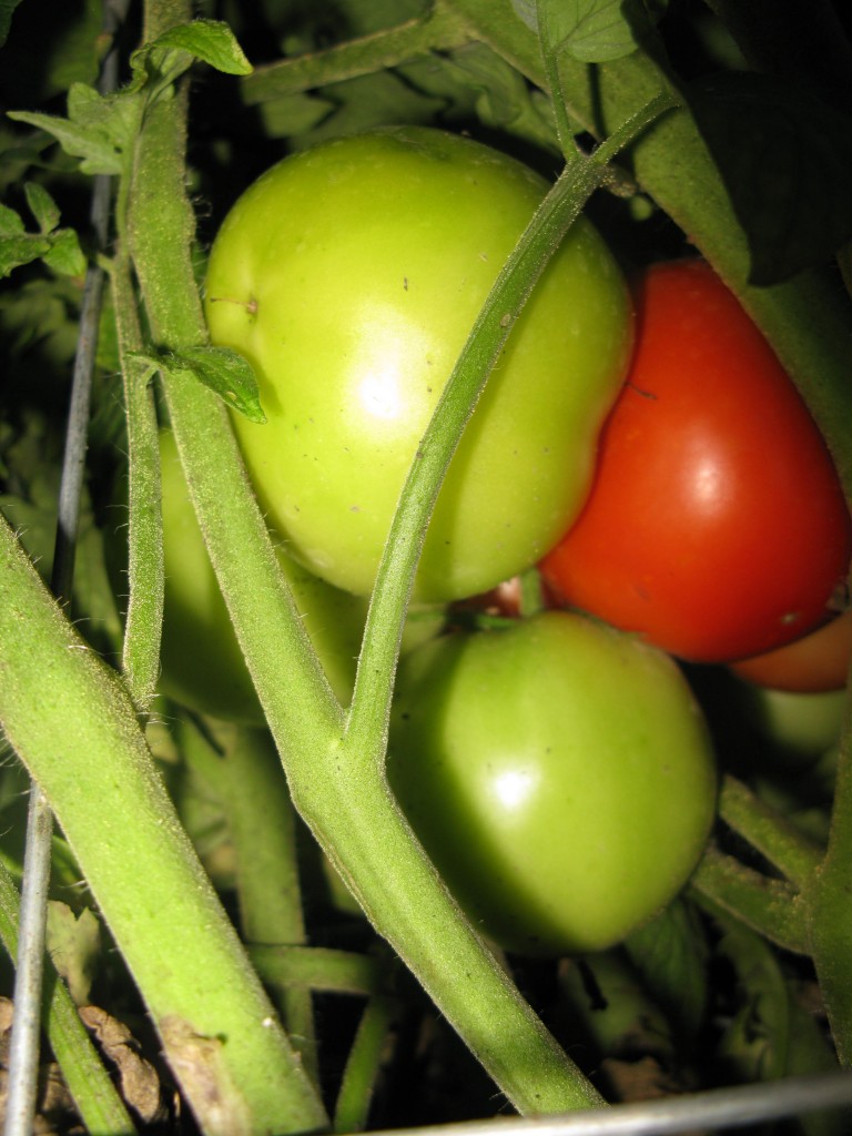The red of the tomato stands boldly against the green vines and the still-green flesh of the tomatoes surrounding it.  My seven-year-old is lured by the red luster and motions for me to help her tug it from the vine.